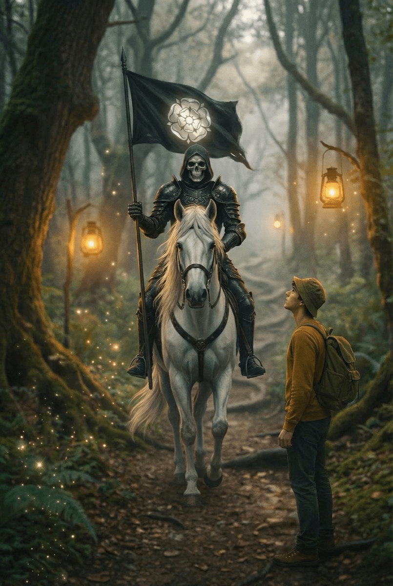 The Fool walks alone under a darkening sky until a lantern appears ahead, held by a figure standing in stillness.