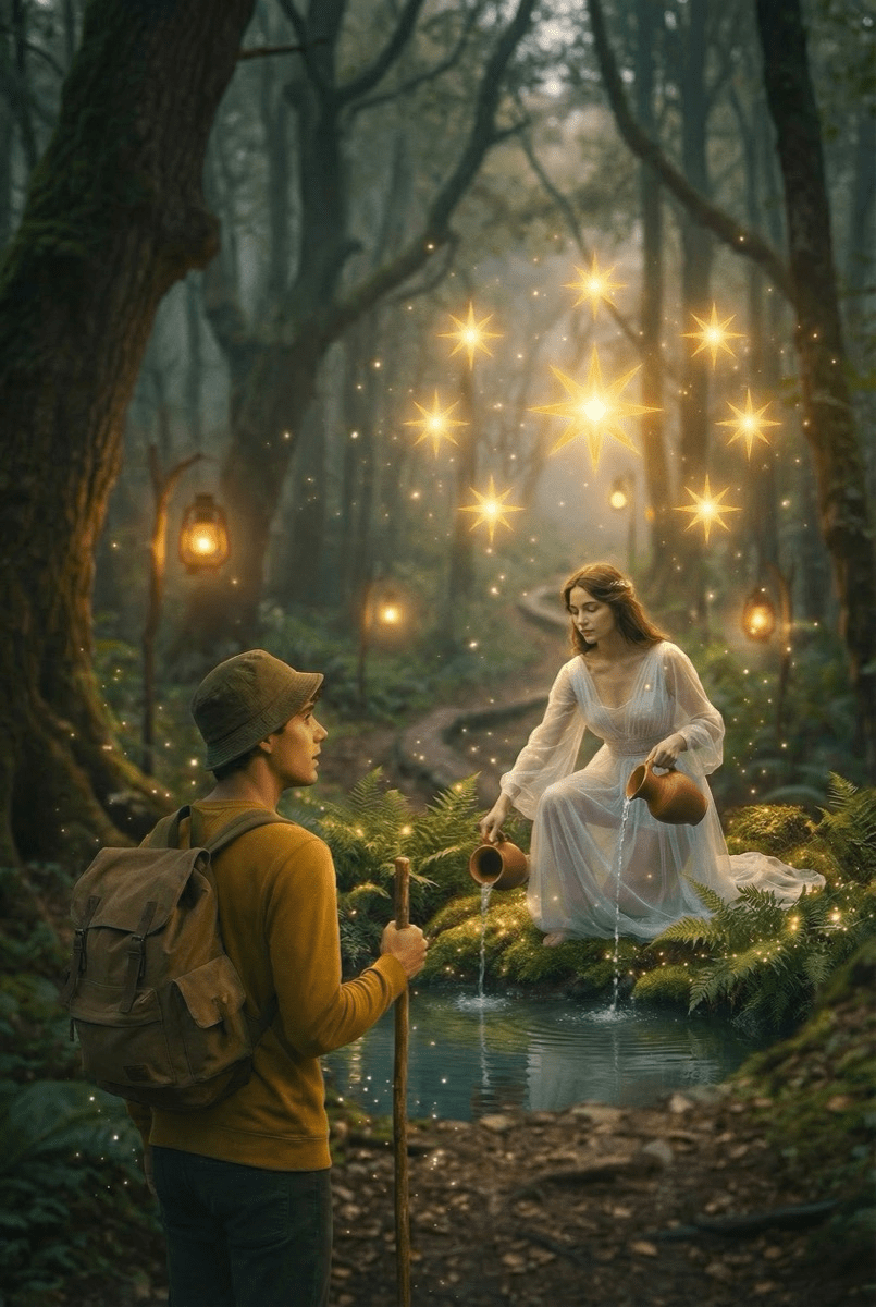 A woman kneels by a gentle pool, pouring water back into the earth and sky.